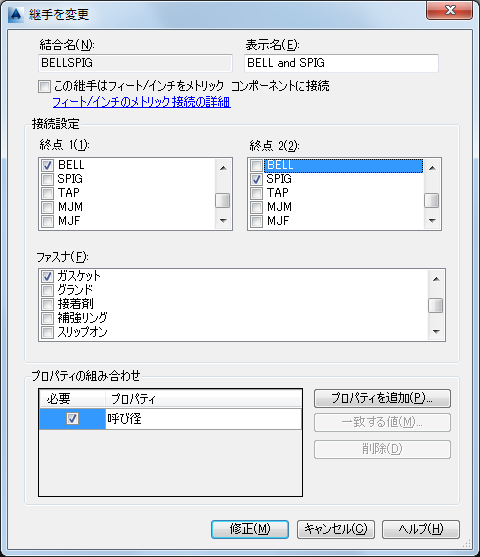 - [プロジェクトセットアップ]ダイアログ ボックスで、[配管接続の設定]をクリックして[結合のセットアップ]ダイアログ ボックスを表示します。