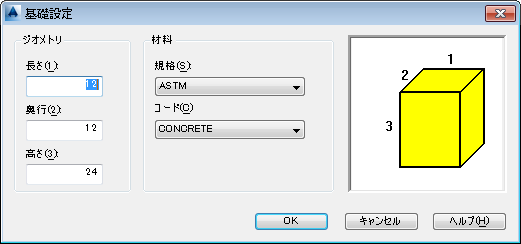 基礎の既定のジオメトリ設定を設定します。括弧内に示されている数値は、プレビュー イメージ内に表示されているジオメトリに対応しています。