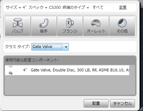 - [使用可能な配管コンポーネント]で、コンポーネント([ゲート バルブ、Solid Wedge、300LB、RF]など)をクリックします。