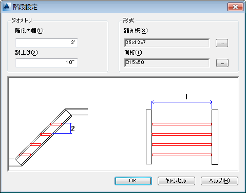 階段のジオメトリ設定を編集します。括弧内に示されている数値は、プレビュー イメージ内に表示されているジオメトリに対応しています。