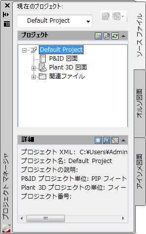 [プロジェクト マネージャ]には、[ソース ファイル]タブ、[オルソ図面]タブ、[アイソメ図面]タブの 3 つのタブがあります。