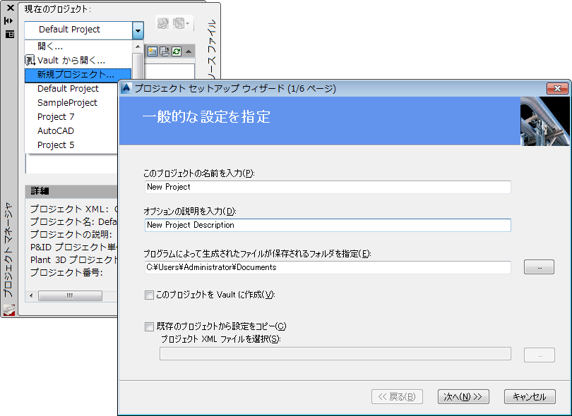 通常、CAD マネージャがプロジェクト テンプレートを設定します。テンプレートとは、会社の標準スペックを満たした構成内容を持つ既成のプロジェクトを指します。CAD マネージャは別のプロジェクトをテンプレートとして指定し、新しいプロジェクトの名前と場所を設定できます。新しいプロジェクトには、テンプレートとして使用されたプロジェクトから設定が継承されますが、この設定は現在の要件を満たすように変更できます。
