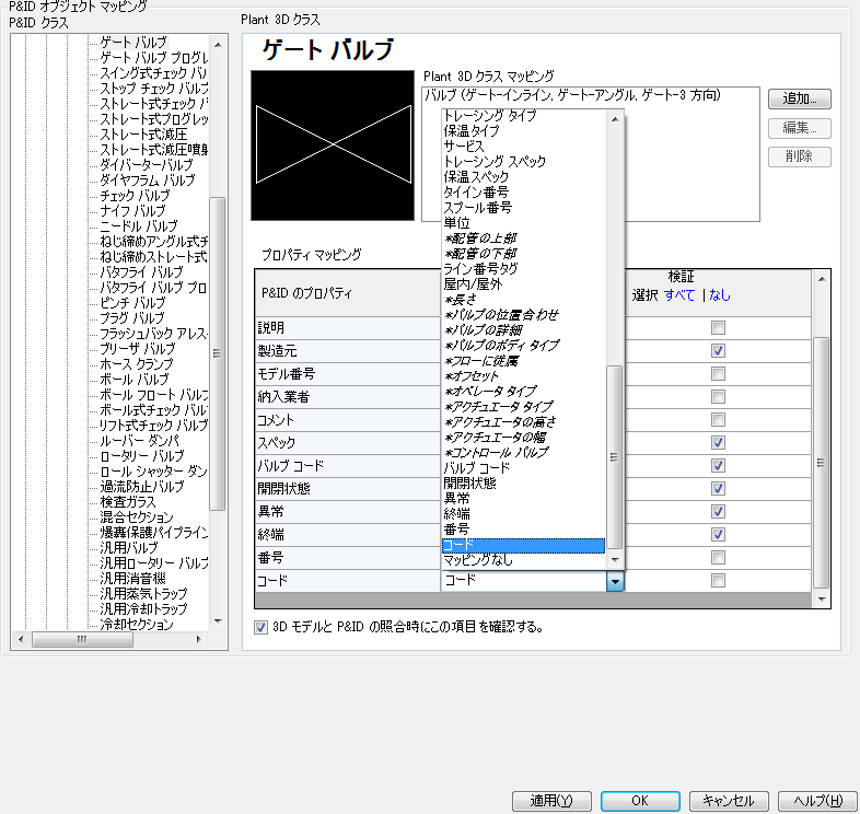 - [P&ID オブジェクト マッピング]ペインの[P&ID クラス]で、ツリーを展開し、プロパティを追加した P&ID オブジェクトをクリックします(例: バルブ )。