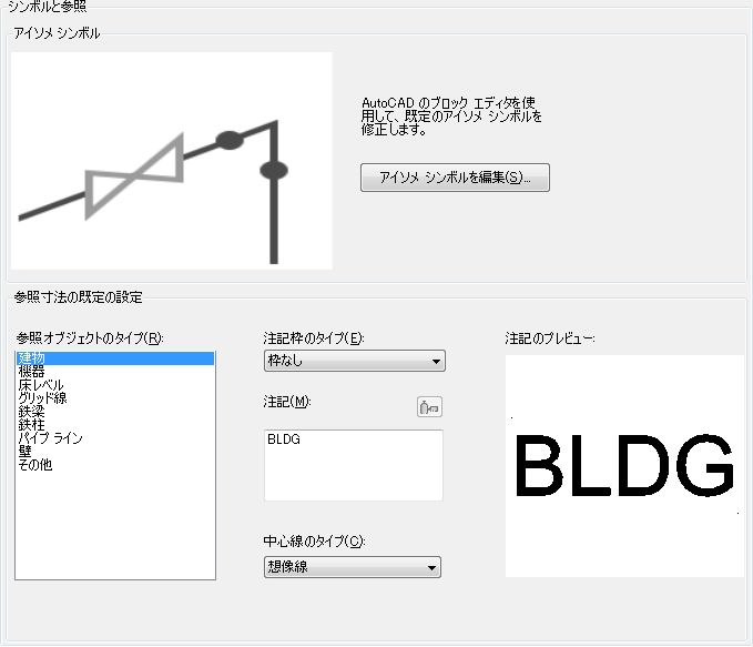 アイソメ図面を作成するときに使用するシンボルを編集します。アイソメ参照寸法の既定のプロパティとテキストを設定します。