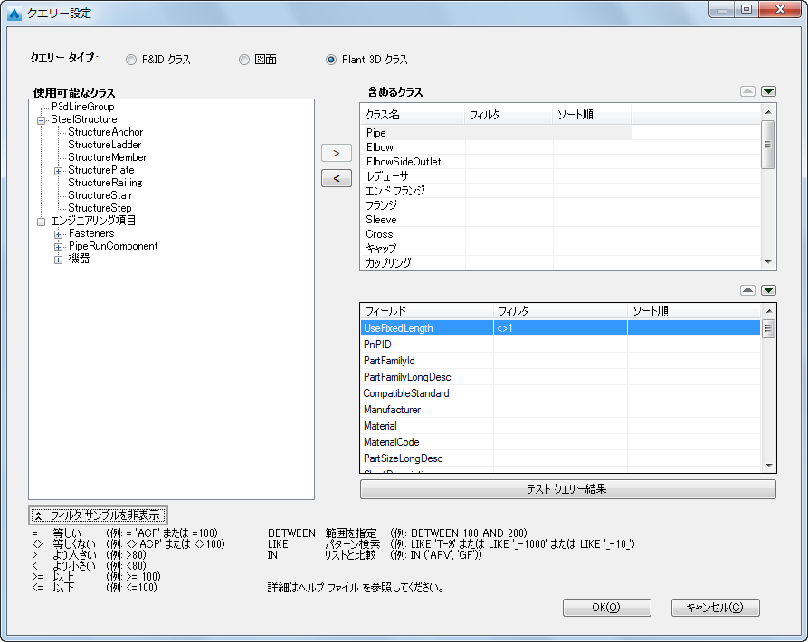 - [クエリー タイプ]で、[P&ID クラス]、[図面]、または[Plant 3D クラス]をクリックします。