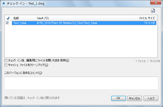- チェック インする図面に他のファイル(Vault 関連ファイル)への参照が含まれている場合、追加図面のチェック イン列を選択することができます。