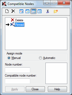 This dialog is used to define compatible nodes in a structure. It means that one defines shared nodes with respect to displacement or rotation for the selected degrees of freedom in the points where structure bars are connected (compatibility). Selected nodes are copied. Each node belongs to a different set of bars. All the degrees of freedom in a node, except those indicated by the user, are mutually independent.