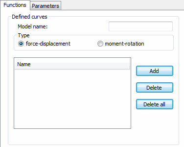This tab has options that let you determine a type of hinge model. A hinge model type determines the units applied. If you select the force-displacement type, then there will be the following units, for example, of force (kN) and of displacement (mm). If you select the moment-rotation type: moment units (such as, kN*m) and angle/rotation (specified) (e.g. rad).