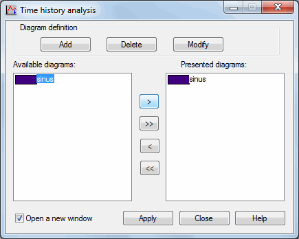 After defining diagrams and transferring them to the Presented diagramspanel, click Apply to display selected diagrams in a window. An example of a diagram for a time history analysis case is in the following image.