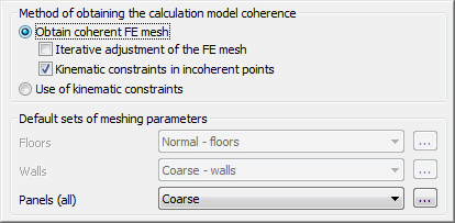 The options allowing to select type of the created finite elements mesh for the structure elements (slabs, walls, panels) are located in the bottom part of the dialog. The following sets of the meshing parameters are available: coarse, normal, fine and user-defined).