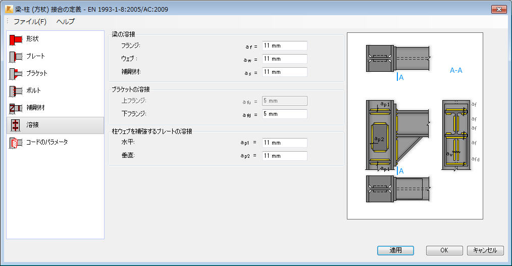 [溶接]タブでは、梁と前面プレートの接合および補剛材と柱ウェブを補強するプレートの接合に使用する溶接の厚さを定義します。