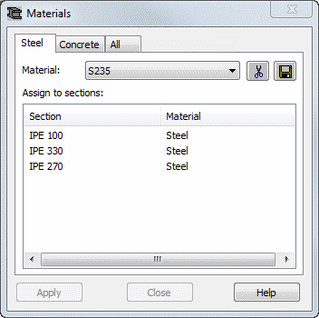 Use the Materials dialog to assign materials to sections selected from the list of active sections (the list under the Assign to sections option).