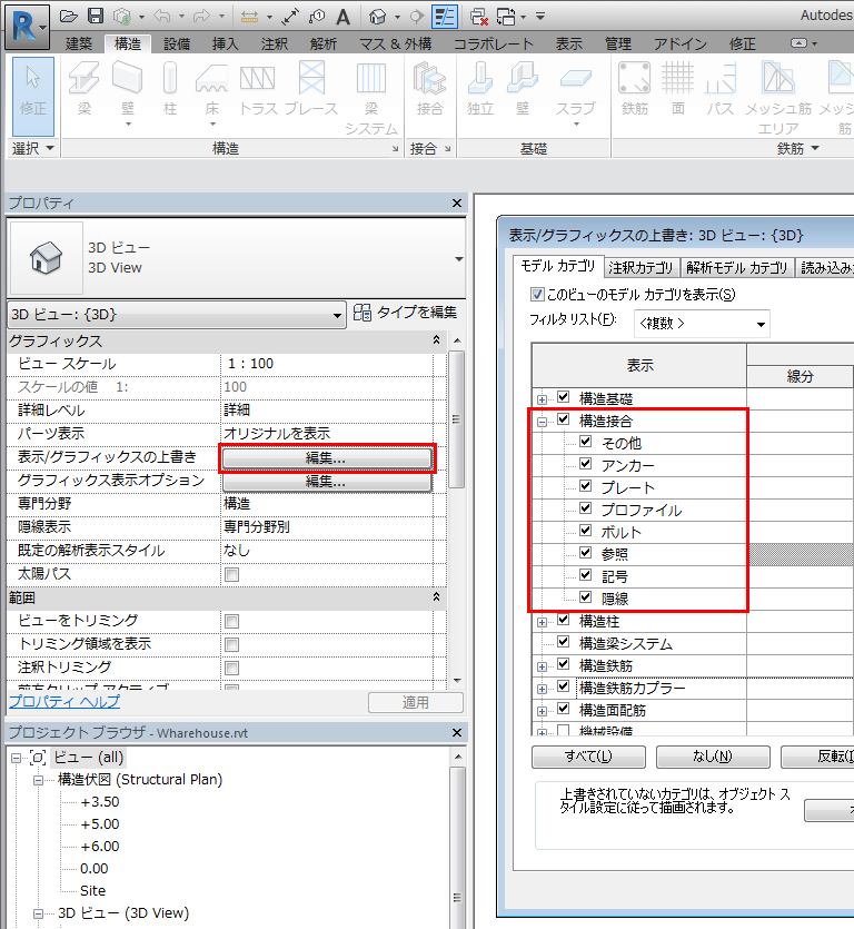 特定のビューにおいては、鉄骨の接合部の表示は[表示/グラフィックスの上書き]メニューでコントロールされます。 接合部品は[構造接合]カテゴリに配置され、[アンカー]、[ボルト]、[プレート]、[プロファイル]、[記号]、[その他]という 6 つのサブカテゴリに分類されます。