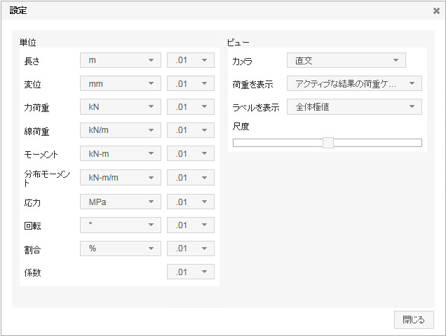 [設定を開く]アイコンをクリックして、[設定]ダイアログを開きます。このダイアログで、ビューに表示される結果の単位を指定することができます。また、モデルと結果について、他の表示設定を指定することもできます。