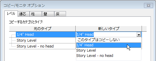 | Revit による特定のタイプの要素のコピーを防ぐ | [元のタイプ]列の要素タイプを探します。[新しいタイプ]列の同じ行で、[このタイプはコピーしない]を選択します。 |