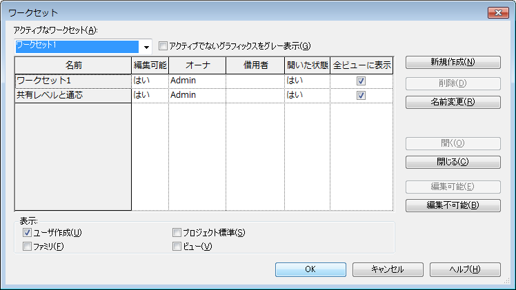 ワークシェアリングを有効にすると、既定のワークセットが複数作成されます(2 つの既定のユーザ作成ワークセット、ならびにプロジェクトやプロジェクト標準、プロジェクト ビューでロードされているファミリ用のワークセット)。