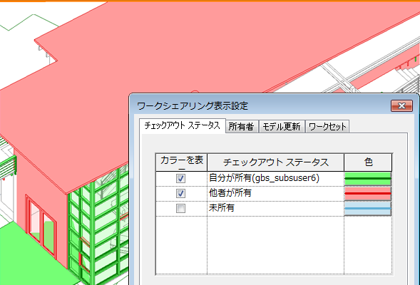 対応するオーナのチェックアウト ステータスに指定した色がモデルで表示されます。