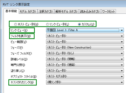 ホスト ビューでリンクされたモデルに対するフィルタの使用をコントロールするには、[RVT リンク表示設定]ダイアログの設定を使用します。