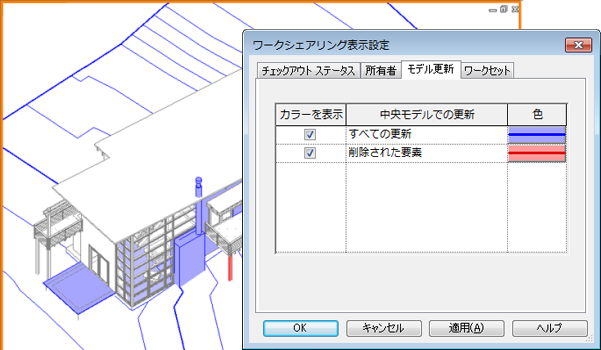 ワークシェアされているモデルのどの要素が、中央モデルで更新または削除されたかを視覚的に区別することができます。