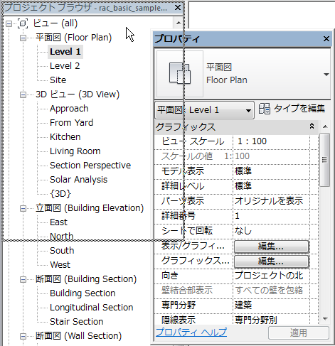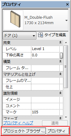 ウィンドウ グループとは、複数のウィンドウを同じ大きさで画面に表示する方法です。ウィンドウをグループ化した場合、グループ内の各ウィンドウの下にはタブが表示されます。グループ内のタブをクリックすると、該当するウィンドウが表示されます。ウィンドウのグループ化とグループ化解除は、必要に応じて行うことができます。次の図では、[プロジェクト ブラウザ]とプロパティ パレットがグループ化されています。プロパティ パレットがアクティブなタブであることに注意してください。