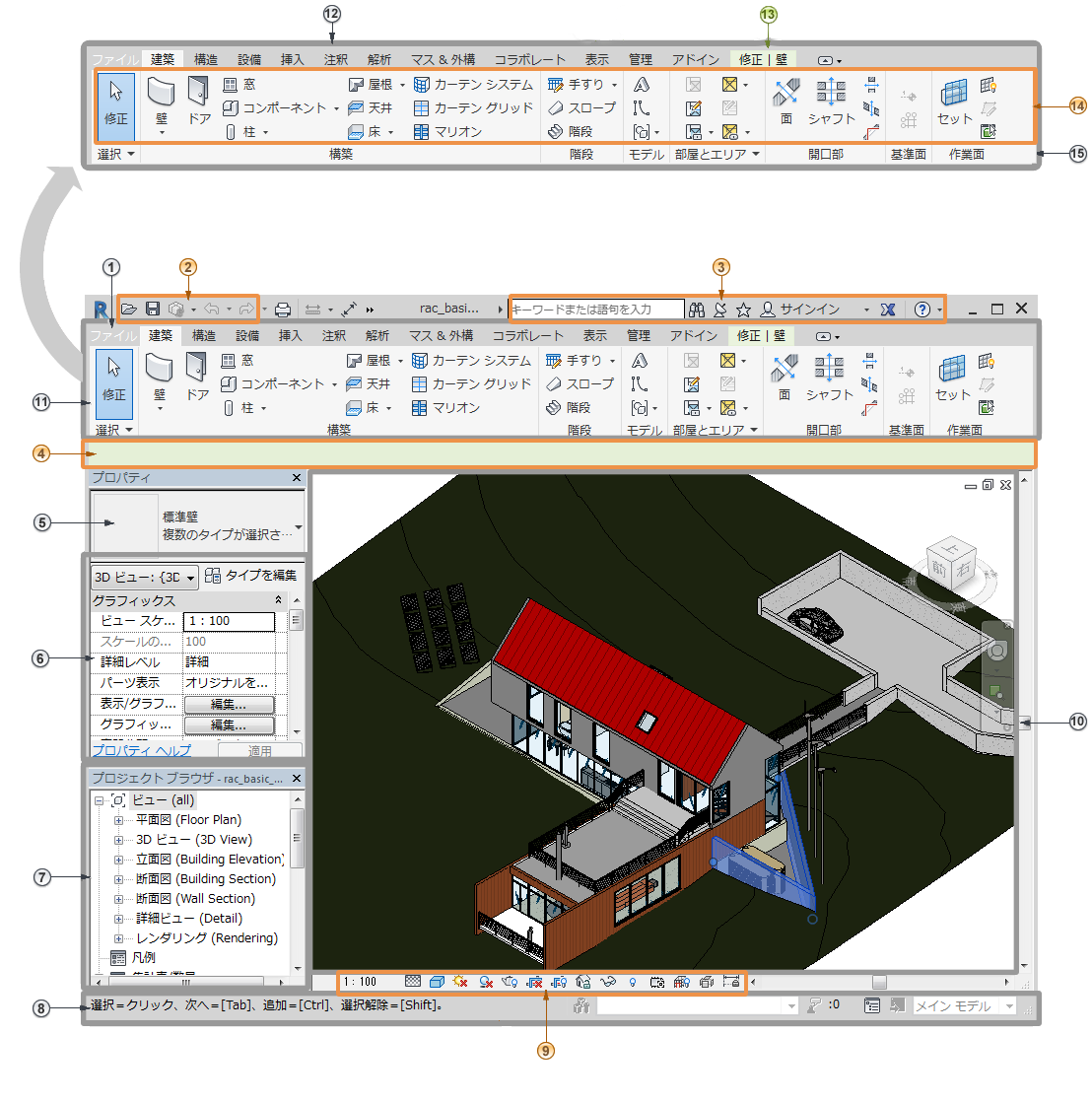 | 13 | リボンのコンテキスト タブ。選択したオブジェクトや現在の操作に関連するツールを利用できます。 |