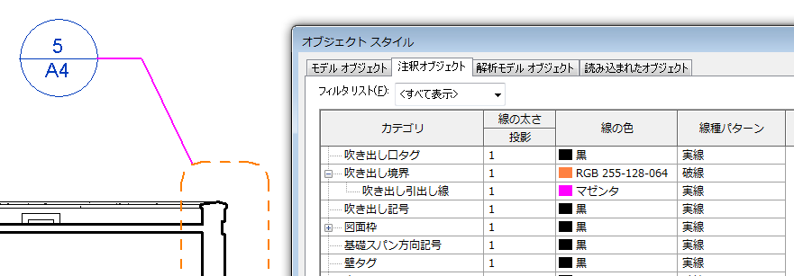 4. 部分詳細引出線、吹き出し引出線、吹き出し記号に目的の設定を指定するには、[線の太さ]、[線の色]、[線種パターン]の各列を使用します。