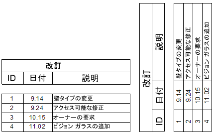 図面枠で改訂記録表を時計回りまたは反時計回りに 90 度回転することができます。改訂記録表を回転するには、図面枠ファミリを修正します。プロジェクト内の特定のシートで改訂記録表を回転することはできません。