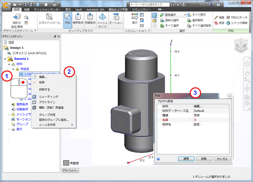 デザイン スタディ バーは、Autodesk® CFD を使用したプロセスのあらゆる側面を定義および管理する、ツリー形式の完全な対話型ツールです。デザイン スタディ バーは、Autodesk® CFD のプロセスを、デザイン スタディ、設計、シナリオの 3 つの基本レベルで構成する階層構造となっています。