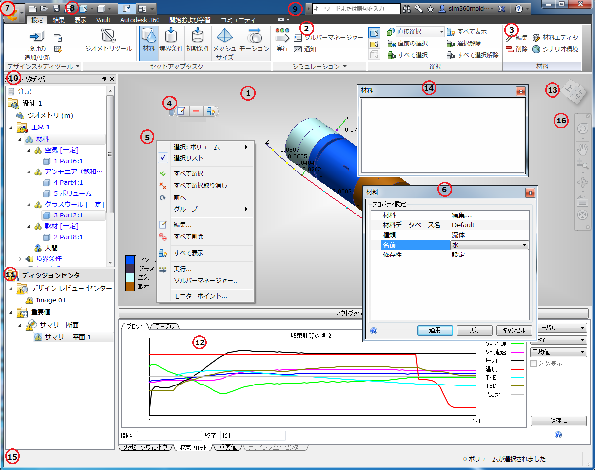 次の図は、Autodesk® CFD ユーザ インタフェースの既定のレイアウトです。