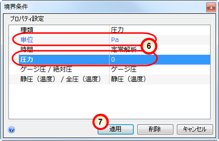 6. [単位]を[Pa]、[圧力]の値を 0 に設定します。