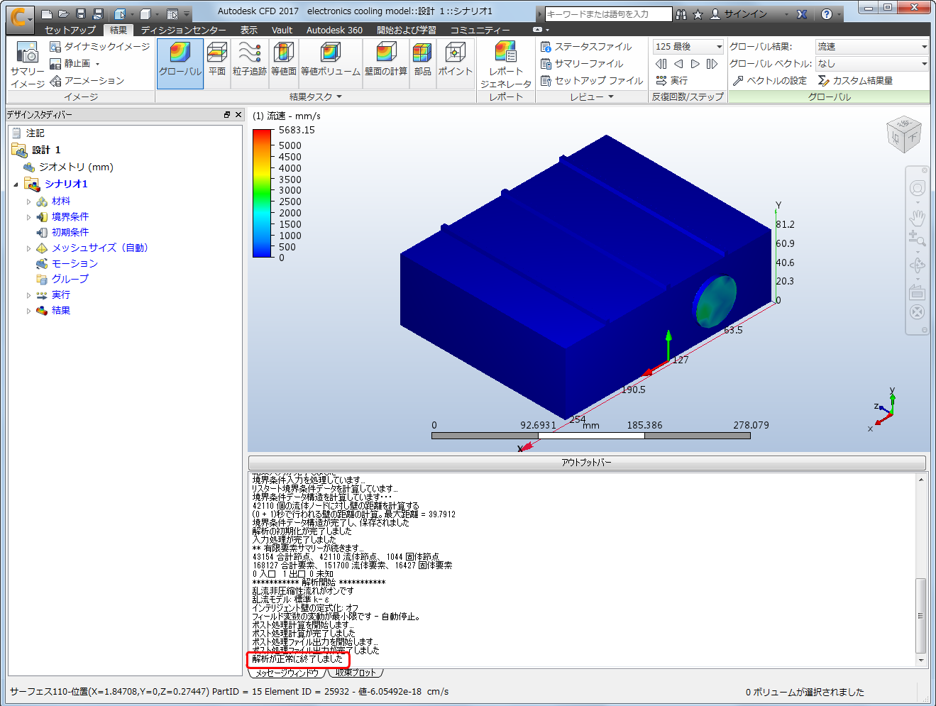 シミュレーションが終了したら、アウトプット バーに "解析が正常に終了しました" と表示されます。