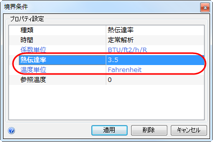 6. [熱伝達率]行に 3.5 と入力し、[温度単位]が[Fahrenheit]であることを確認します。