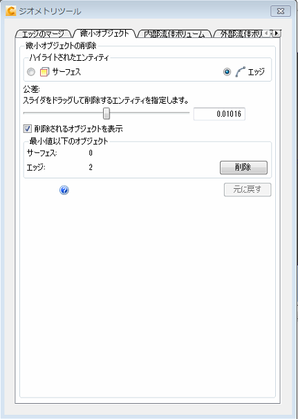 このダイアログは小さなエッジが見つかったことを示していますが、それらはモデルの意図的な部分であるため、削除はしません。