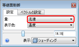 1. [等値面制御]ダイアログ ボックスで、[量]と[表示色]の両方を[温度]に変更します。