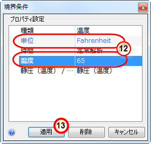 12. [単位]が[Fahrenheit]であることを確認します。[温度]行に 65 と入力します。