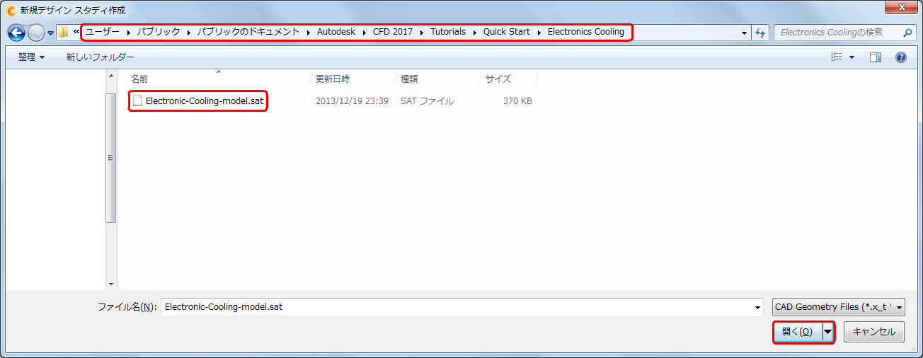 3. C:\Users\Public\Public Documents\Autodesk\CFD 2018\Tutorials\Quick Start\Electronics Cooling にナビゲートし、Electronic-Cooling-model.sat を選択します。[開く]をクリックします。