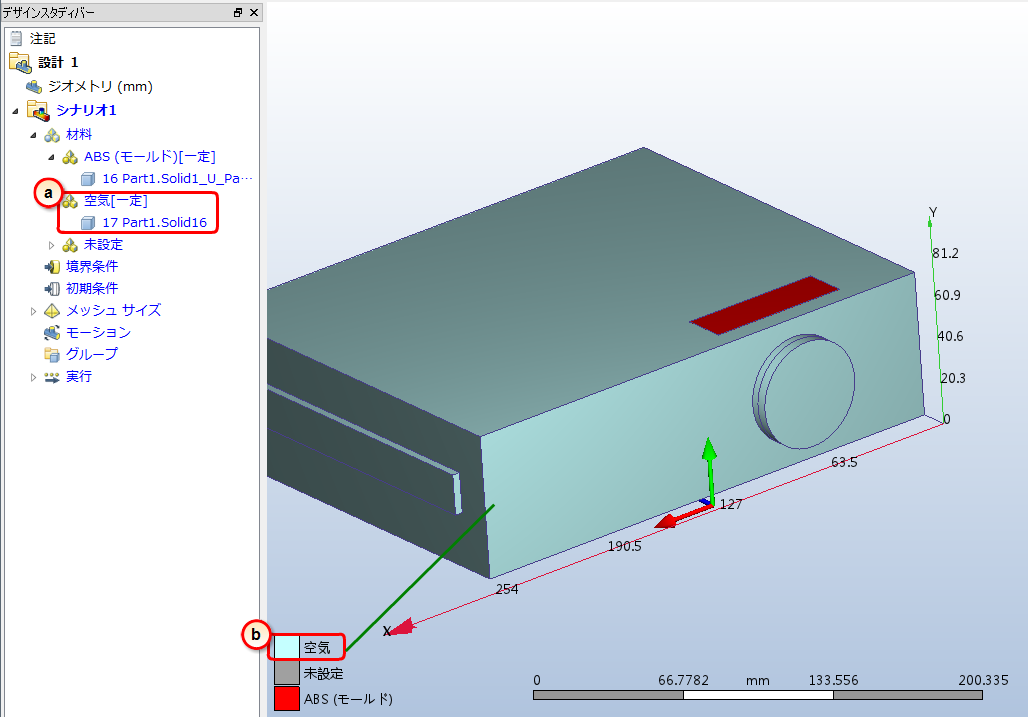 6. 空気材料が正しく割り当てられていることを確認するには、デザイン スタディ バーと部品の色付けを調べます。