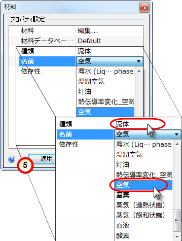 4. [材料]クイック編集ダイアログで、[種類]が[流体]で、[名前]が[空気]であることを確認します。