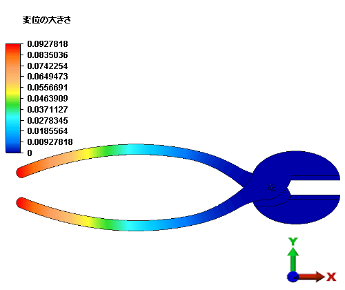 ソリッド メッシュの作成後に解析が開始され、次のように、結果環境にモデルが表示されます。既定では、変位の大きさが最初に表示されます。