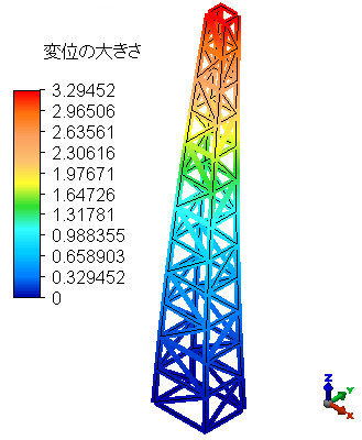 解析が開始され、結果環境にモデルが表示されます。既定では、変位の大きさが最初に表示されます。
