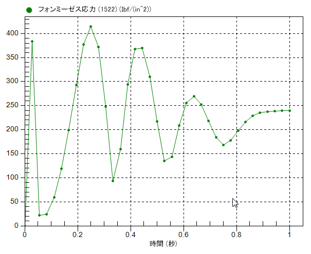 ここでは、ピーク応力が発生した 0.25 秒での応力分布を確認し、最も強い応力を受けた節点での応力対時間をグラフにします。