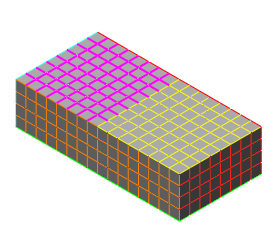 | サーフェスごとに色分け: 大きい方の部品の上面が選択されている状態(マゼンタ)。表面分割オプションを使用しない場合、上面が 1 つの大きなサーフェスになっている点に注目してください。 | サーフェスごとに色分け: 大きい方の部品の上面を左端付近で選択されている状態(マゼンタ)。表面分割オプションを使用する場合、上面が 2 つの部分に分割される点に注目してください。 |