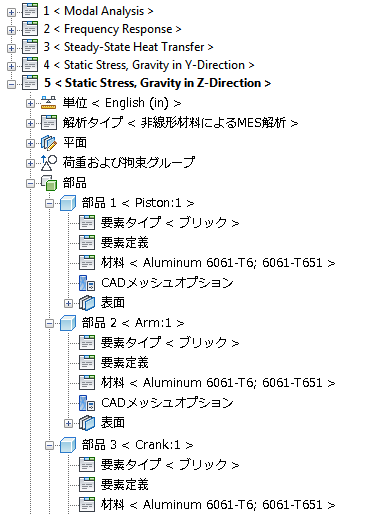 1 つの FEA モデル(1 つの .FEM ファイル)には、多数の解析または設計シナリオを格納できます。各シナリオの解析結果は、メイン モデル フォルダ下にある個別のフォルダに保存されます。たとえば、1 つのモデルに次の解析をすべて含めることができます。