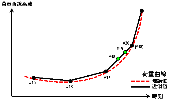 時間ステップ #15、#16、#17 では理論上の曲線に従っています。#18 が収束した場合、荷重は理論上の曲線「(#18)」に留まります。しかし時間ステップが縮小した場合は、時間ステップ #18 と #19 が補間され、荷重がわずかに変化します。多くの場合、この変化は無視できます(特に FEA による近似を考慮した場合)。