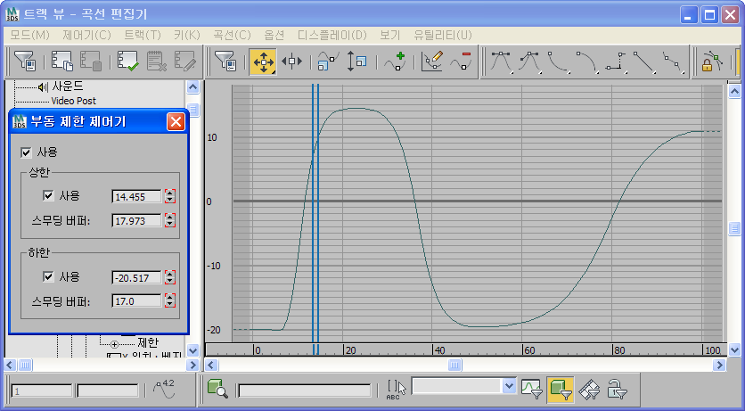 키프레임 및 기타 표준 방법을 통해 스무딩 버퍼 값을 애니메이션하고 제어기의 제한 분기에서 하한 스무딩 트랙을 통해 트랙 뷰에서 이 애니메이션을 조작할 수 있습니다.