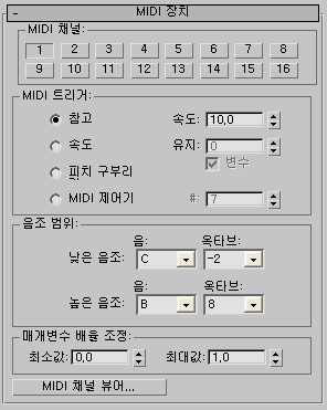 이 그룹에는 16개의 버튼이 있습니다. MIDI 장치에 채널을 지정할 수 있습니다.