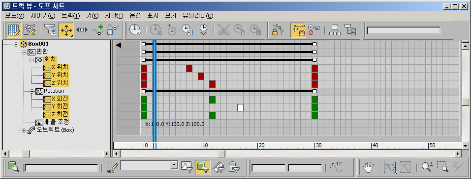키 편집이 활성 상태이면 그리드 상에서 키프레임이 직사각형 안의 상자로 표시됩니다. 키는 색상이 서로 구분되어 키프레임 대상을 표시합니다(위치는 빨강, 배율 조정은 노랑, 회전은 초록색 등).