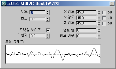 제어기 할당 롤아웃의 리스트 창에서 회전 트랙을 선택합니다. 3ds Max에 노이즈 제어기 대화상자가 열립니다.