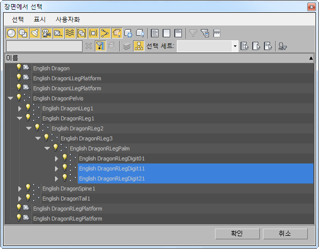 대화상자가 모달이므로 리스트의 강조 표시된 항목과 장면의 해당 오브젝트 선택 간에 자동으로 동기화되지 않습니다. 선택하려면 먼저 대화상자에서 선택할 오브젝트를 강조 표시한 다음 확인을 클릭하여 대화상자를 닫고 오브젝트를 선택합니다.