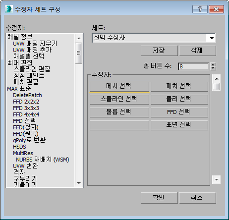 이 대화상자를 사용하여 수정 패널의 사용자 정의 수정자와 버튼 세트를 만들 수 있습니다.